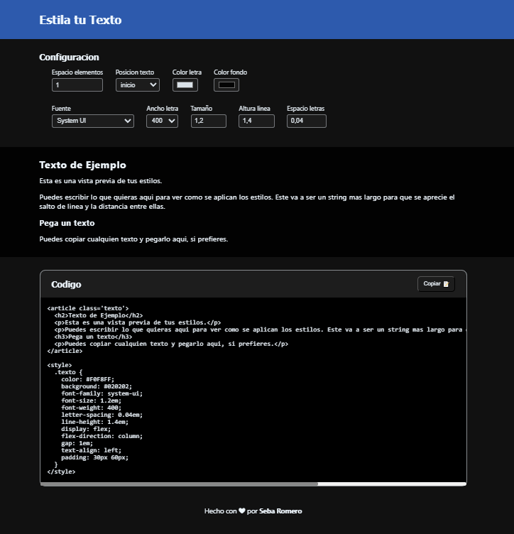 An intuitive and easy-to-use styling tool. Choose your styles while seeing changes in real time, then copy and paste the code directly into your project.